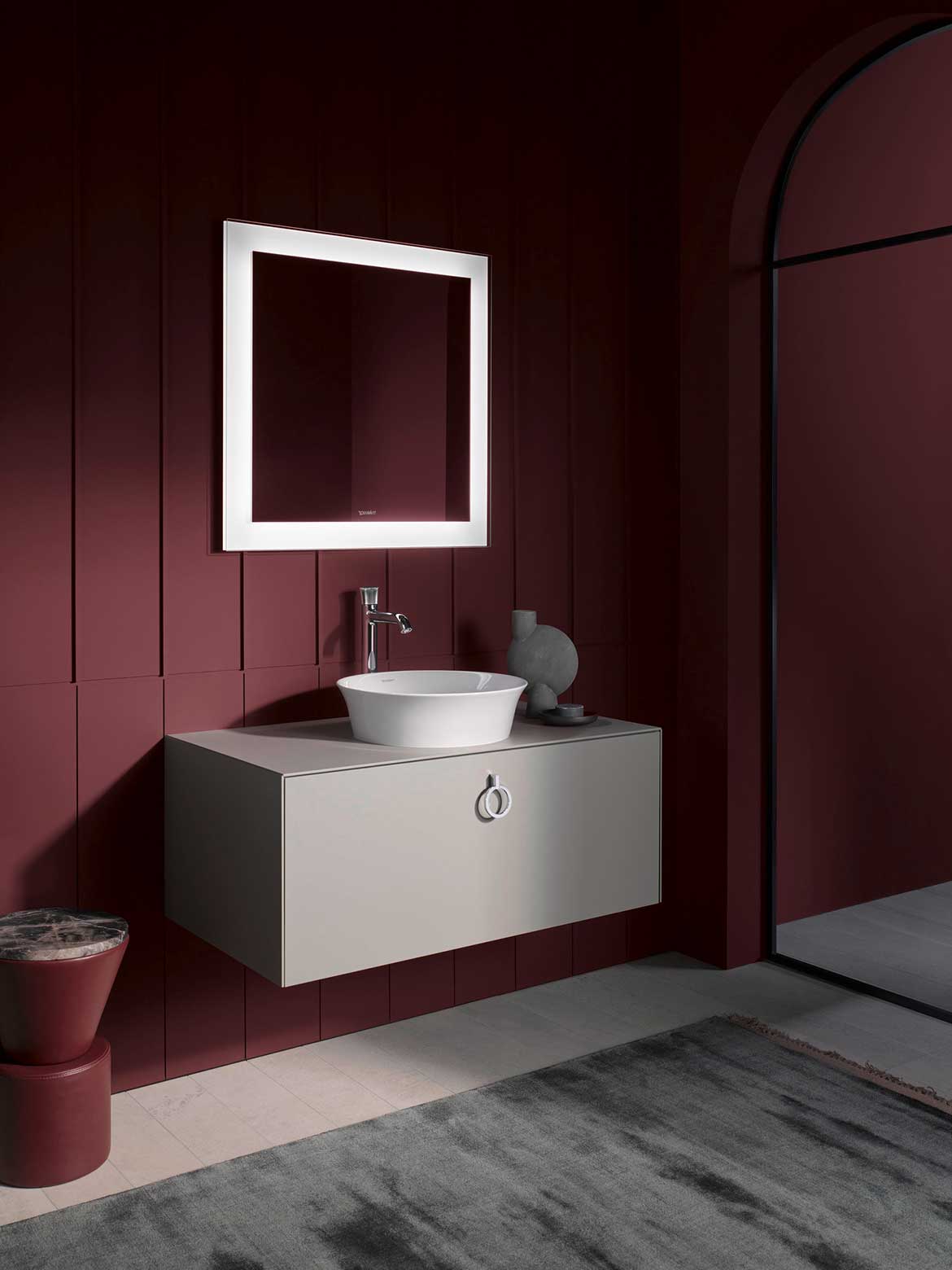 (Burdeos) hilo rojo: White Tulip de Philippe Starck combina con elegancia líneas fluidas y orgánicas con una geometría precisa. Su lenguaje de diseño es a la vez escultural y atemporal, y por lo tanto abre una amplia gama de opciones de diseño. En combinación con un color burdeos intenso, la serie crea un efecto espacial acogedor, casi sensual, que irradia calidez, estilo y confort.