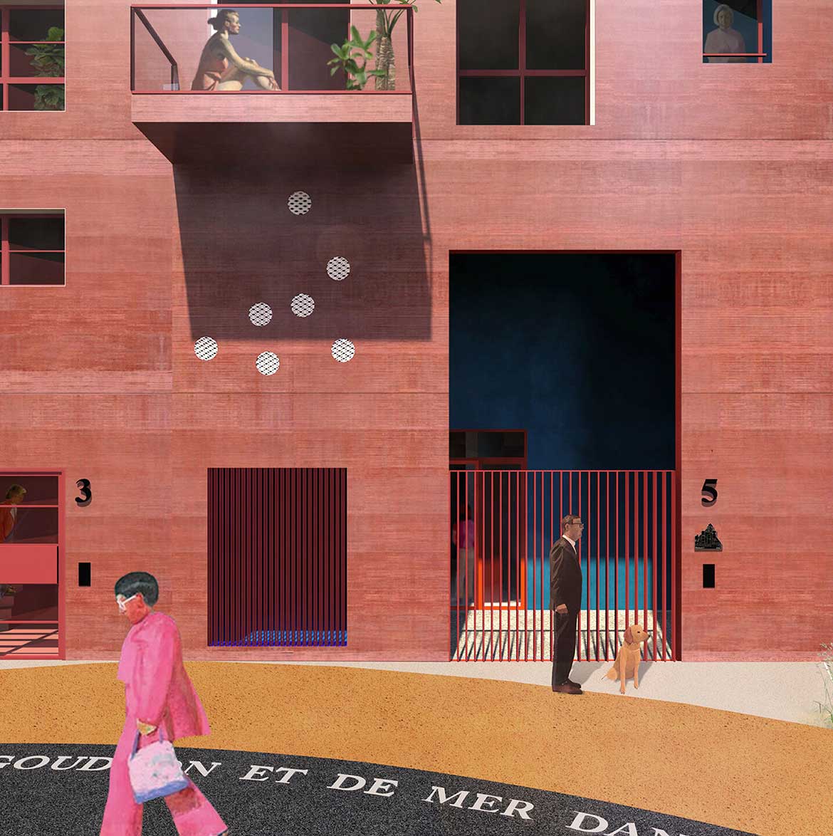 3. The security zone around each geothermal wellhead, materialised by an orange asphalt oval, shapes the arrangement of buildings in the square.